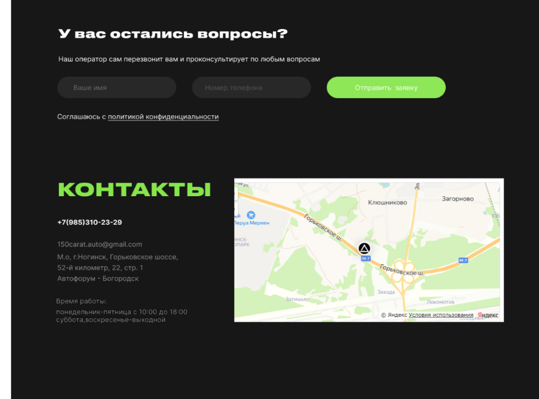 Делаю открытую форму обратной связи для клиентов, чтобы они могли получить консультацию по интересующему вопросу. Также добавляю контактные данные, карту и адрес, чтобы клиенты могли легко обратиться к нам.