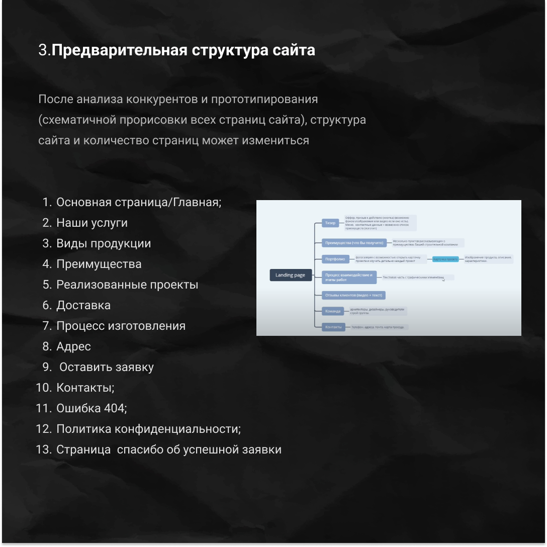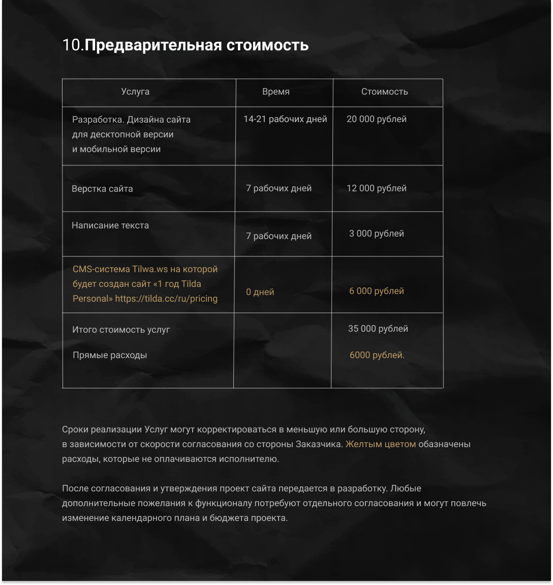 После утверждения структуры, делаю расчёт стоимости всего проекта. Составляю К П, в котором фиксирую основные моменты: задачи, сроки и цены, этапы работы и что входит в разработку сайта.